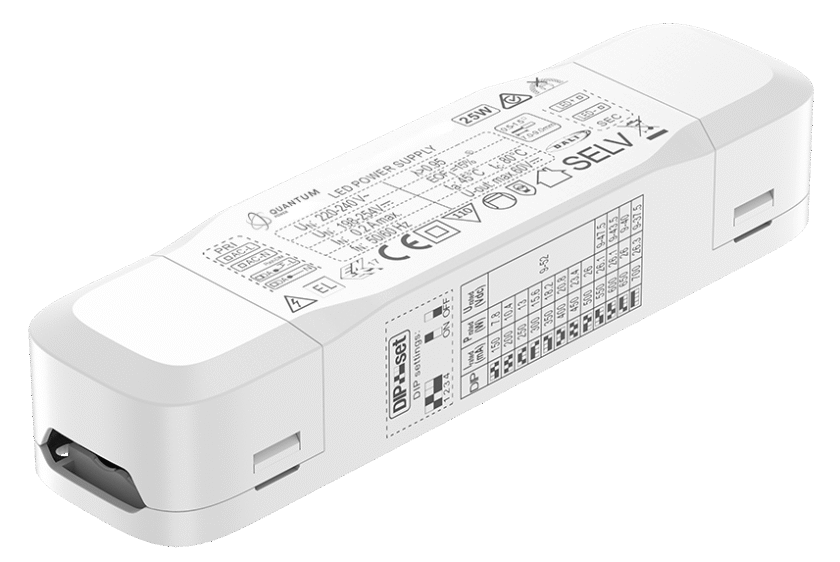 QPEC-42-1050 LD ADV is a 42W constant current LED driver with a wide output current range from 300mA to 1050mA, adjustable via DIP switch. It operates on 220–240VAC input and delivers high efficiency (up to 88%) with a power factor of 0.95. Designed for LED panels and downlights, it features flicker-free output, IP20 protection, and full safety protections including short circuit, overvoltage, overload, and over-temperature. Its compact size (9...
